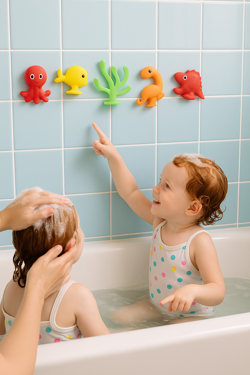 He sticks them all over the wall and counts the animals before I start washing. Total game-changer for our nightly routine. 10/10 from both of us! — Daniel P., Dad of 2 kids